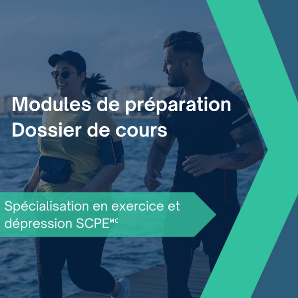Ces quatre modules interactifs en ligne offrent une préparation spécifique à l’obtention de la Spécialisation en exercice et dépression de la SCPE🅪 et visent à vous donner la confiance nécessaire pour travailler avec des clients atteints de dépression. Ils vous aideront à développer vos connaissances sur les troubles dépressifs, la recherche sur les interventions basées sur l’exercice et les stratégies de changement de comportements.
